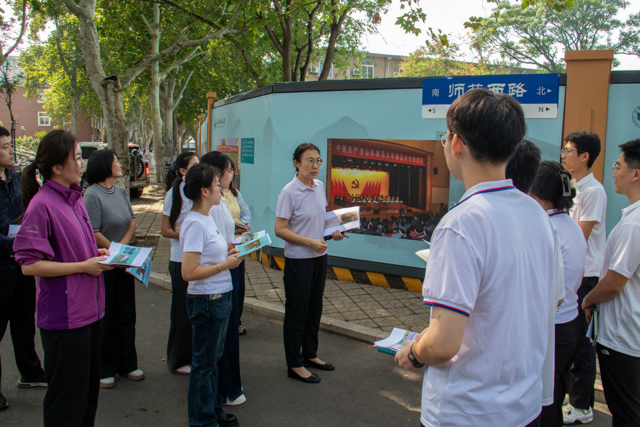 此次备课学习以“人人争当宣讲员,师大辉煌记心间”为主旨。在场人员一方面以参观文化墙为依托,细致了解学习校史内容,认真观看图片文字,不时驻足讨论;另一方面,大家共同研讨讲解注意事项,围绕如何更加生动地结合图片资料讲好师大故事分享体会。围挡文化墙上丰富的校史内容,全景式呈现了山东师大走过的光辉历程,既见证了学校七十五载的坚实足迹,也彰显了山师人奋斗不止的坚定信念。这些珍贵印记已凝结为“尊贤尚功、奋发有为”的校园精神,在场师生无不深受鼓舞,信心倍增。