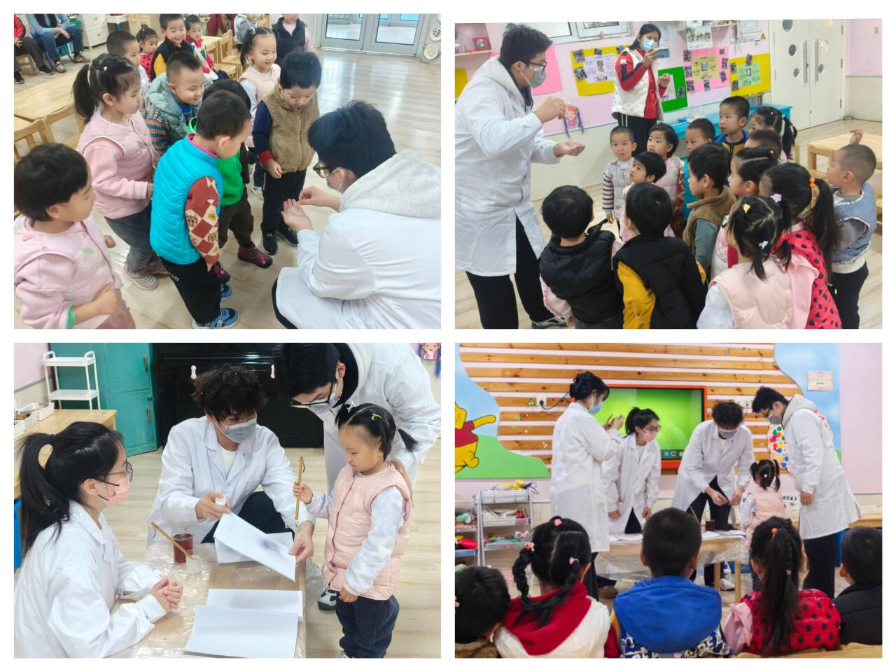 活动开始后,志愿者首先向孩子们介绍了实验内容与安全注意事项,以简洁易懂的语言说明实验原理,引导孩子们建立对化学现象的初步认知。随后,志愿者带领孩子们完成三项实验:在碘钟实验中,通过混合试剂,让幼儿观察液体在黄、蓝两色间的周期性变化;“丝线魔法”环节,借助高分子材料的黏弹性,指导孩子亲手搅拌出可拉伸的丝状胶体;淀粉密信实验里,孩子们用淀粉溶液在纸上书写图案,经碘酒喷涂后,隐形痕迹显现为蓝色,直观感受淀粉的特性。