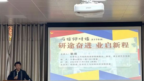 11月14日下午,校团委与学院团委于千佛山校区一号教学楼1201报告厅共同举办了“研途奋进,业启新程”与信仰对话活动。此次活动邀请学院副院长耿琰主讲,学院党委副书记魏宁主持活动,团委书记房超与团员青年近100人参加活动。